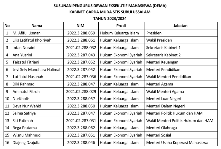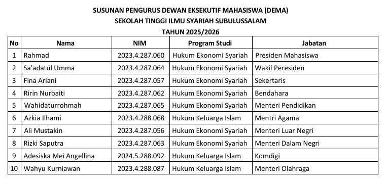 Tahun 2020 lembaga ini bernama BEM (Badan Eksekutif Mahasiswa), kemudian tahun 2021 bertransformasi menjadi DEMA (Dewan Eksekutif Mahasiswa) dengan tugas pokok sebagai berikut: