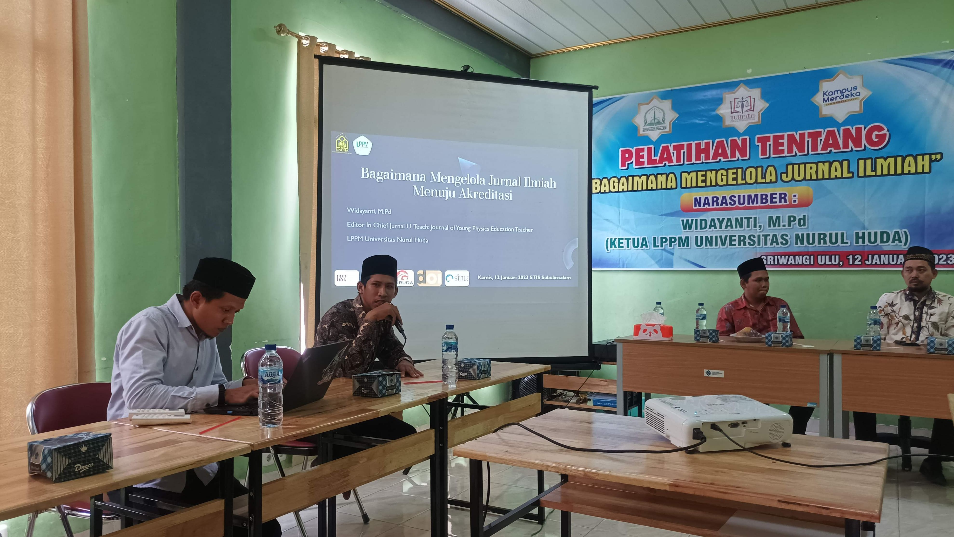 HUKAMA Jurnal Hukum Islam STIS Subulussalam sebagai jurnal baru yang baru menerbitkan 5 artikel ilmiah dan baru keluar SK Penerbitan ISSN dari Badan Riset dan Inovasi Nasional (BRIN) pada 2 Desember 2022 lalu, tentu ibarat bayi yang masih belajar merangkak, butuh proses dan waktu dalam mengelolanya sampai Sinta. “Kita bersyukur, Ibu Widayanti, M.Pd selaku Ketua Lembaga Penelitian dan Pengabdian kepada Masyarakat (LP2M) Universitas Nurul Huda berkenan hadir sebagai narasumber menularkan ilmunya”. Kata Ahmad Munawir, M.Pd Wakil Ketua Bidang Kemahasiswaan, salah satu reviewer Jurnal HUKAMA. Widayanti, M.Pd hadir besama tim dan menyatakan siap membantu dan mendampingi HUKAMA Jurnal Hukum Islam STIS Subulussalam sampai akreditasi.